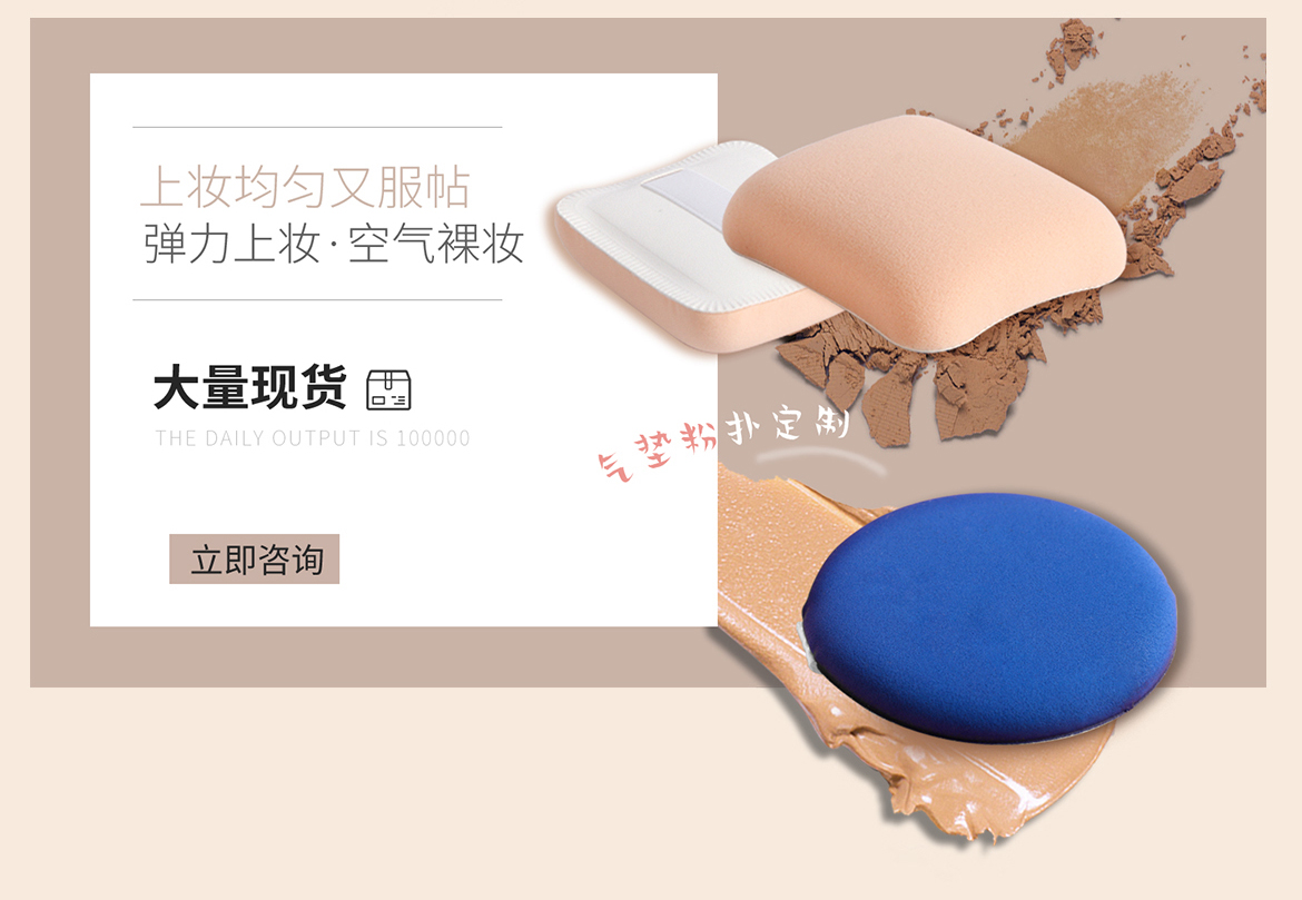 云然注冊(cè)在著“世界工廠”之稱的東莞市,相關(guān)工廠從事海綿銷售加工20余載2014年4月成立東莞市云然化妝用品有限公司,同年9月成立東莞市靚妝化妝用品有限公司公司致力于各種高品質(zhì)化妝用粉撲的生產(chǎn)與銷售。產(chǎn)品種類涵蓋了氣墊粉撲、非乳膠粉撲、氣墊海綿、散粉撲五大類別。可以根據(jù)客人需求進(jìn)行個(gè)性化貼牌定制、進(jìn)口原材料,采用日韓技術(shù)及生產(chǎn)工藝、品質(zhì)。被廣泛應(yīng)用于化妝/美容等行業(yè)。